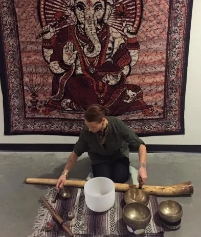 Group sound healing by Athene at the Tannery Arts Center, Santa Cruz, CA, 2015.